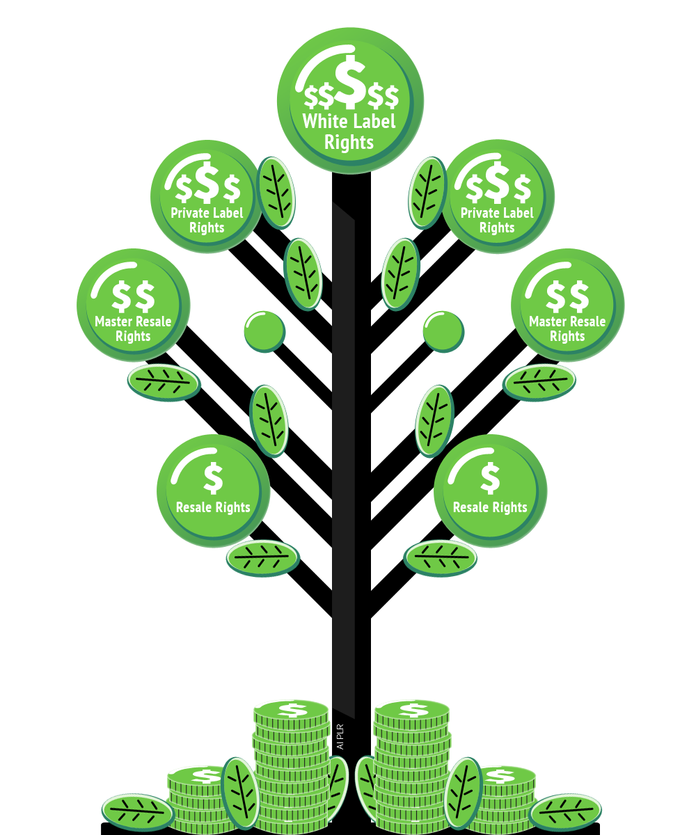 Rights like this are not simply Reseller Rights or even PLR Rights. To truly be at the TOP of the tree you need OWNERSHIP (White Label) rights. Let’s break it down in a tree format with dollar weight from the top: